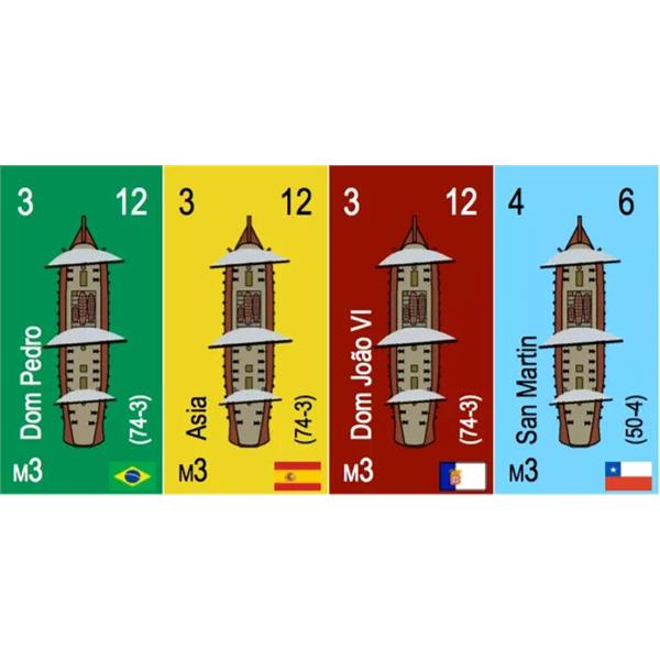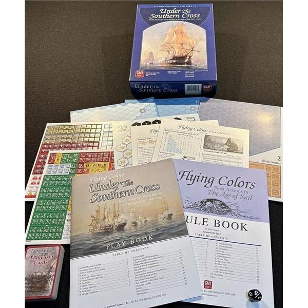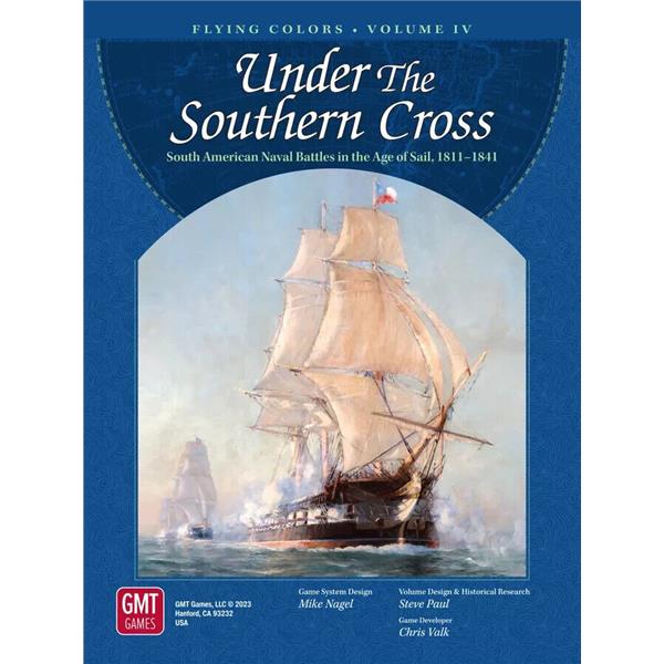 Under the Southern Cross: The South American Republics in the Age of Fighting Sail is the fourth volume of the highly regarded Flying Colors series of games on naval combat. The focus is on the southern part of the South American continent: Brazil, Argentina, Uruguay, Chile, Peru, Bolivia, and Ecuador, from the Wars of Independence starting in 1810 through the last naval war fought completely under sail between Argentina and Uruguay in 1841. These wars attracted naval officers recently unemployed by the end of the Napoleonic Wars as well as providing a proving ground for the first generation of naval heroes native to Latin America. Updated rules introduce river and tidal currents, modified grounding rules for operations in the Rio de la Plata and Uruguay rivers, and the use of ship’s boats to tow stranded or becalmed ships. In all, over two dozen battle scenarios ranging in size from a handful of ships per side, to full-blown fleet actions are presented. Also included is the return of the popular ship duel map and activation cards originally found in Serpents of the Seas (Flying Colors volume II), along with 18 ship duel scenarios.