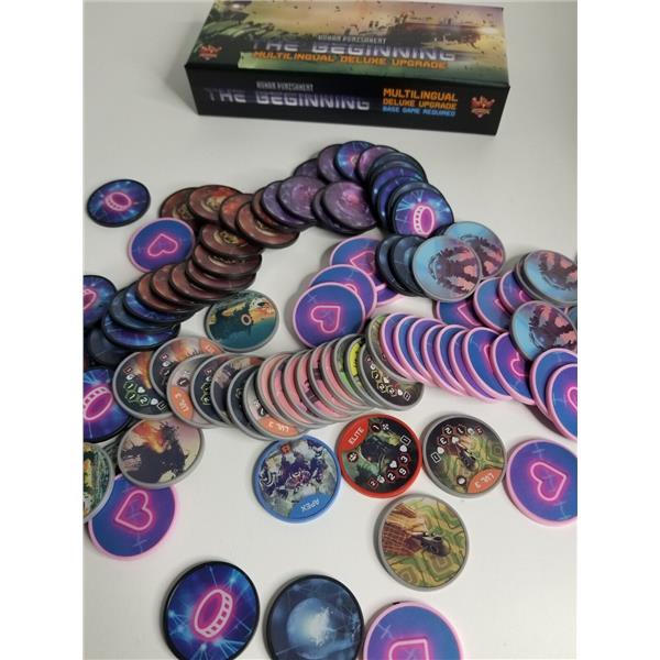 This listing is for the Kickstarter Exclusive Edition including all stretchgoals. It also includes the Deluxe Upgrade containing 100 deluxe metal core chips (poker quality). 40 Data Chips, 36 Enemy Chips, 1 Apex Chip, 1 Deus Chip and a bonus of 22 Health Chips which can be stacked under enemies for a faster overview.