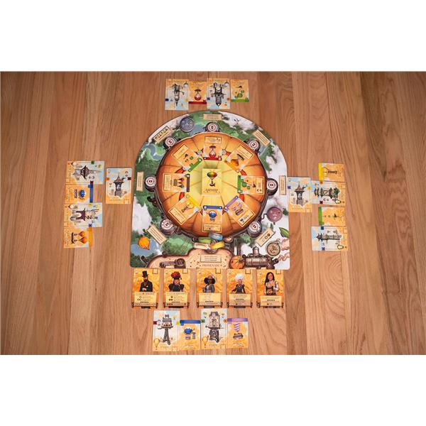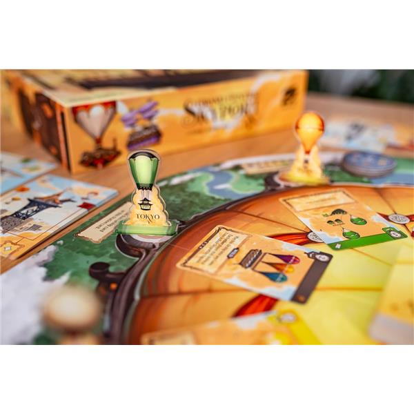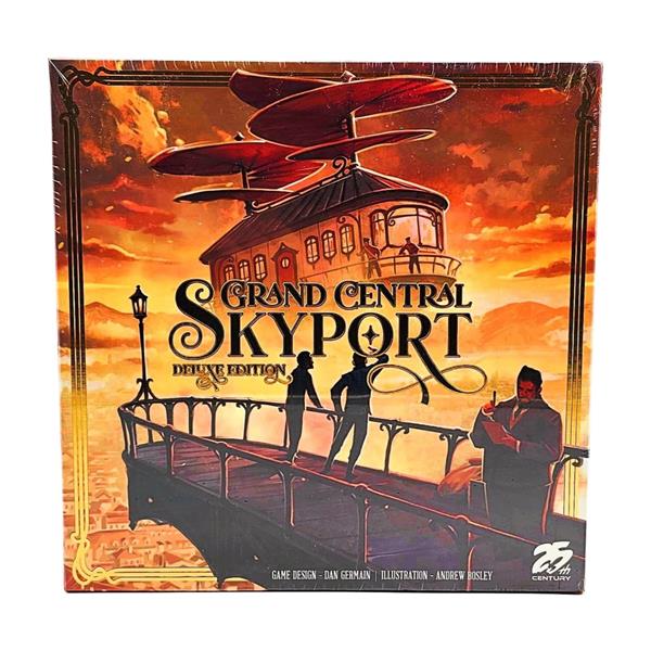 In Grand Central Skyport, you want to efficiently operate your airship station and attract the most prestigious tycoons to your city. During the game, you attract new airships to your skyport, and each airship has a color and an initial slotting movement. Try to maneuver your airships to group them by color so that they stack to score increasingly more points. Unfortunately, with each new ship entering your station, its movement will trigger the rearranging of previously placed airships, so ideally you can race other skyport owners around a central rondel to choose the incoming airships that are best for you.