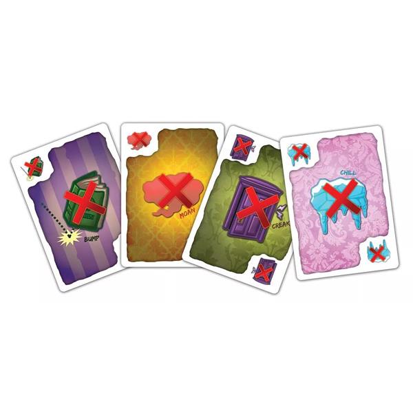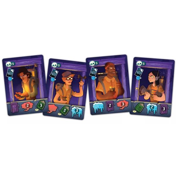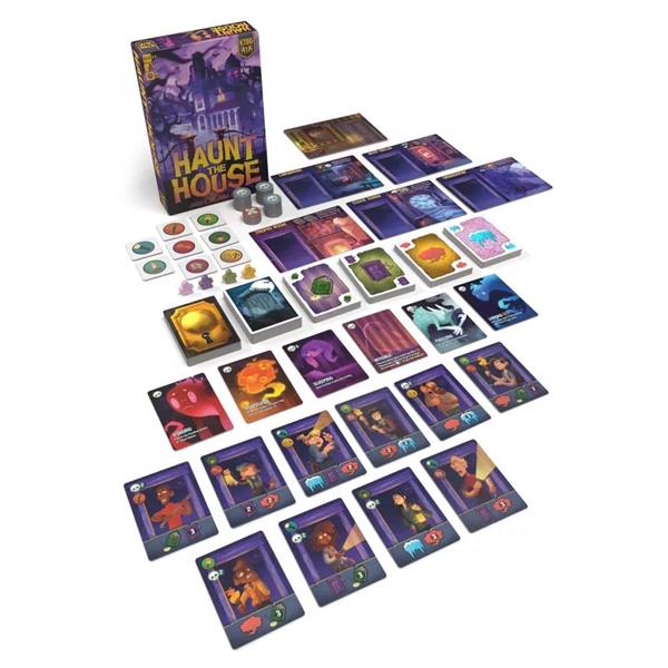 In Haunt the House, we are ghosts competing to scare Ghost Hunters out of the various Rooms of our haunted house, and collecting their exploration gear as trophies. Each Ghost Hunter is scared out only by a specific combination of Scares. Each player has a hand of Scares they will use to try and get those Ghost Hunters out!
