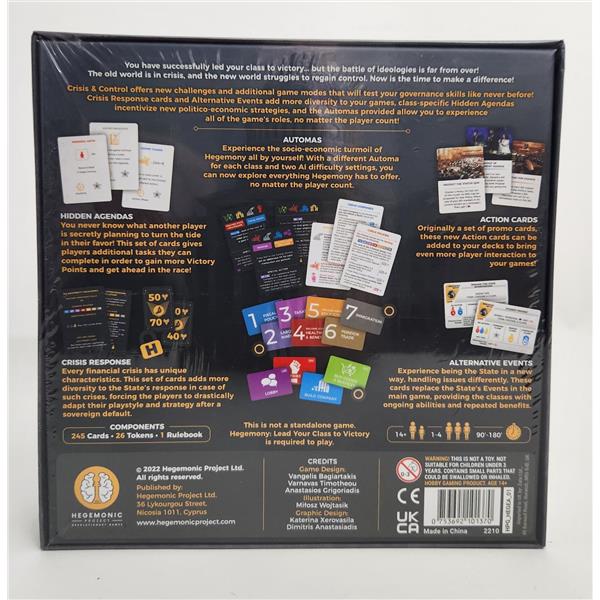 Crisis & Control offers new challenges and additional game modes that will test your governance skills like never before! Crisis Response cards and Alternative Events add more diversity to your games, class-specific Hidden Agendas incentivize new politico-economic strategies, and the Automas provided allow you to experience all of the game’s roles, no matter the player count!