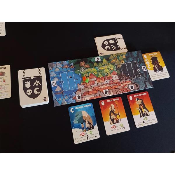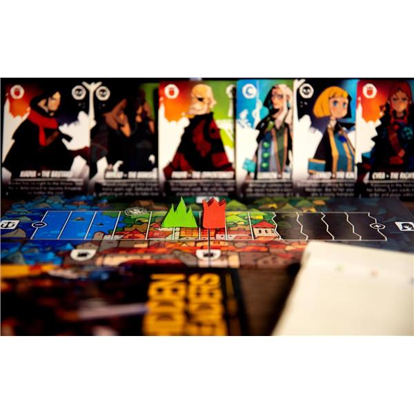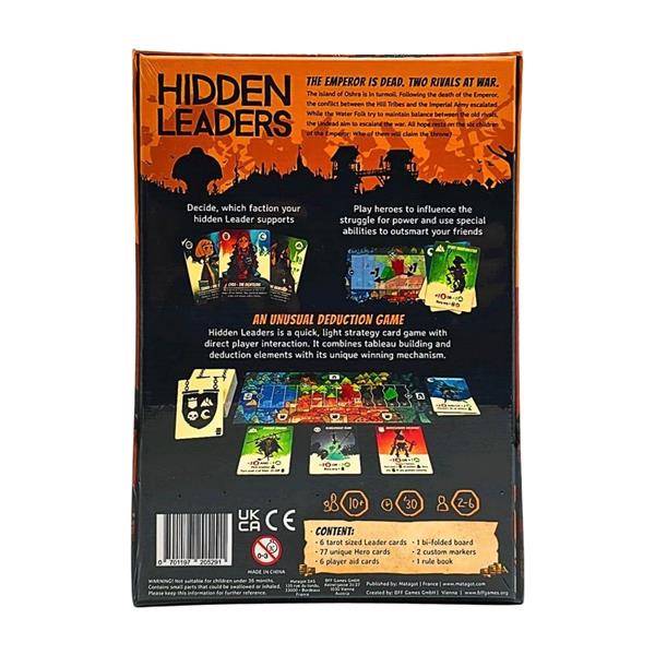 In Hidden Leaders, you take the role of one of six secret leaders, each of them is allied with two of the four factions/colors. By playing heroes into your tableau, either openly or secretly, you influence the outcome of the conflict.