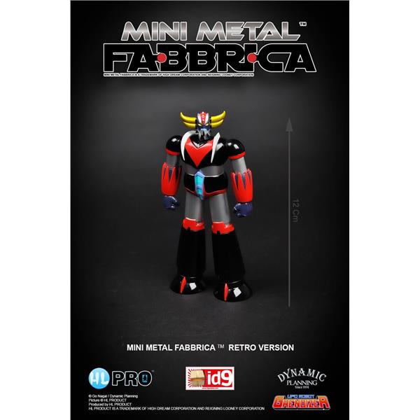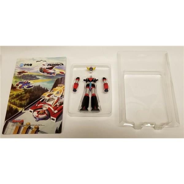 The smallest of Grendizer diecast figures available now. It stands almost 5 inches high with limited articulation. It comes in a hard blister pack that can be opened without damaging the packaging.