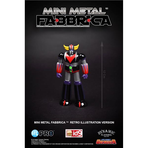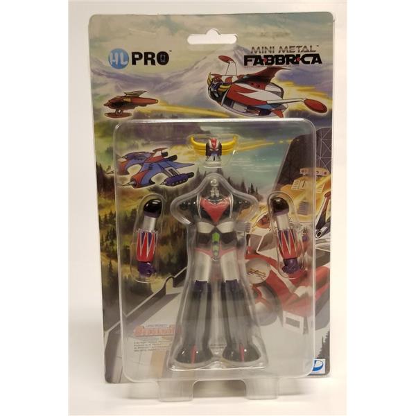 The smallest of Grendizer diecast figures available now. It stands almost 5 inches high with limited articulation. It comes in a hard blister pack that can be opened without damaging the packaging.