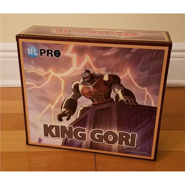 King Gori resembles a gigantic gorilla adorned in brown armor with yellow accents including a spiked helmet with a pair of yellow spikes coming out of the sides on its head and one drill tipped horn coming out of the top.