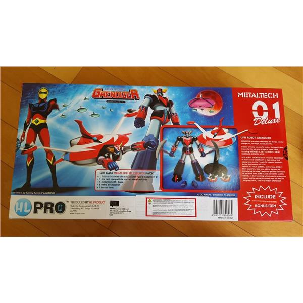 The box includes a METALTECH01 die cast action figure with 4 accessories, a ball jointed base, a metaltech01B+ die cast spaizer (spaceship) and 2 wing accessories.