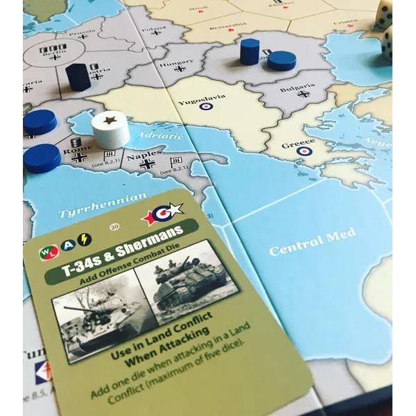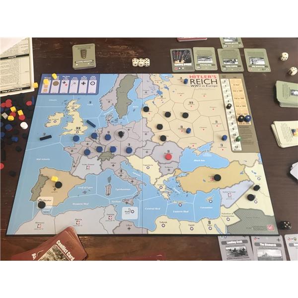 No stacks of armies, no hexes, no overly-lengthy rules to learn - Hitler’s Reich takes five minutes to set up and two hours (or less!) to play. Players fight over Europe, across North Africa, the Atlantic and Mediterranean, and into Russia using a simple dice-enhanced conflict card comparison combat mechanism. Or, as one BGG poster better put it, "a simultaneous revelation of cards similar to Twilight Struggle’s Headline Phase, but with a choice of what Conflict Card to play" - all with dice added in. High-quality wooden pieces mark their progress, which is aided economically, politically and on the battlefield through the competition for and play of Event Cards drawn from three unique decks: one for the Axis, one for the Allies, and one from which either side can attempt to draw.