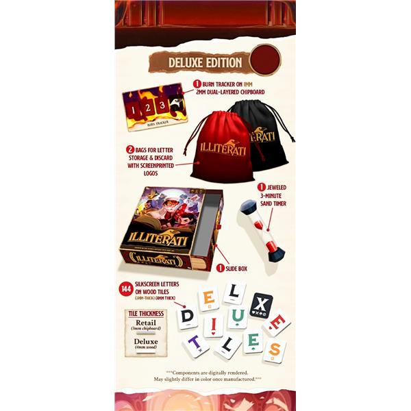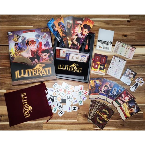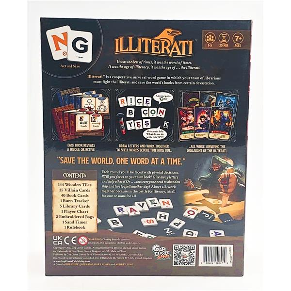 Illiterati is a real-time, co-operative word game in which players work together to form words and bind books. Each player starts the game with five letter tiles and a red torched book that shows a condition that player must achieve to restore that book, e.g. using 8+ tiles with at least 3 green symbols, create words that are all animals. A library of three random tiles is placed in the center of the table. The game takes place in three-minute rounds, and before the round begins each player draw seven letter tiles from the draw bag.