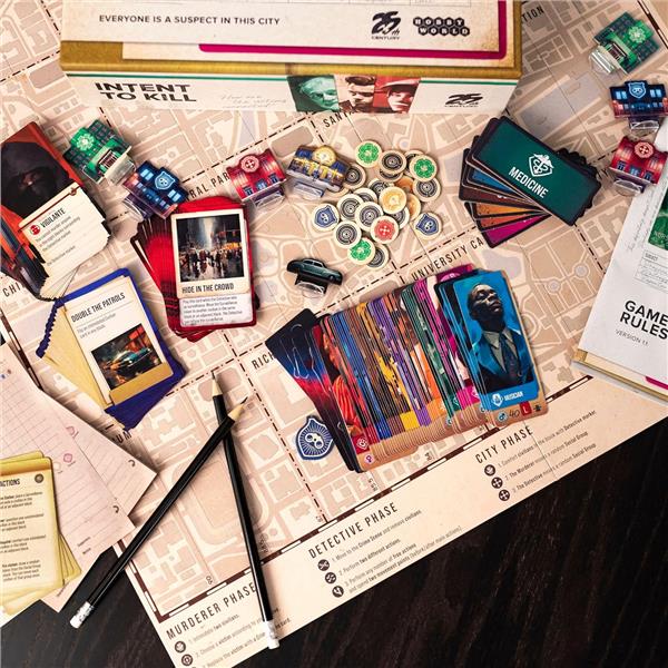 A new murder is committed each round. The detective can move around the blocks and question civilians that might have useful information. The murderer can intimidate civilians to stall the investigation. The game ends after the fifth murder.