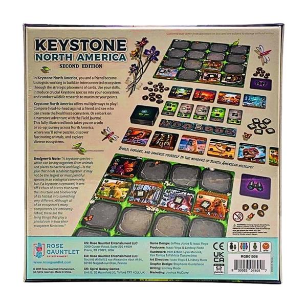 In Keystone: North America, you and your friends will take on the role of biologists and work to build an interconnected ecosystem through the careful placement of cards. Use skills, introduce important Keystone animals, and perform wildlife research to maximize your points.