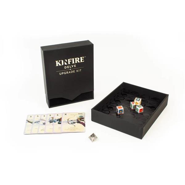 Improve your Kinfire Delve experience with this premium update. The upgrade kit includes six holographic Seeking Lantern cards to light your path, a custom metal 10-sided Countdown die, and four epoxy resin Delve dice. Each piece brings quality and flare to your game, giving you the perfect tools to take on the challenges of the Well Masters with confidence and brilliance.