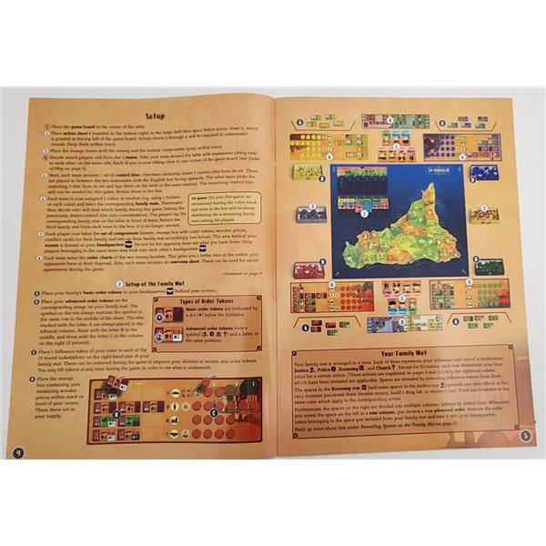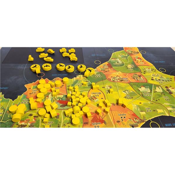 In La Famiglia: The Great Mafia War, you play against each other in teams (2 vs. 2) to take control of Sicily. Six different mafia families, each with special abilities, are at your disposal. The game rounds are divided into two phases: In the planning phase, you develop your abilities and bring fighters as well as secret orders to the board. In the combat phase, these orders are revealed and executed. Here, you use your fighters and bombs to dominate as many regions as possible. The combat system is both simple and innovative, making every fight an exciting psychological duel. The team that best combines and coordinates its abilities will finally dominate Sicily.