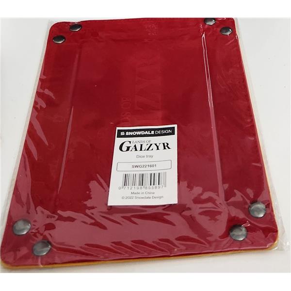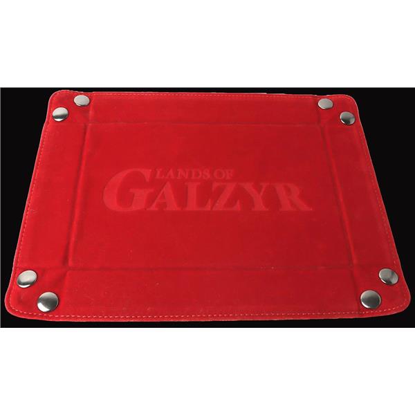 A felt dice tray with etched Lands of Galzyr logos both inside and outside. The corners can be snapped open and the tray stored flat inside the game box.