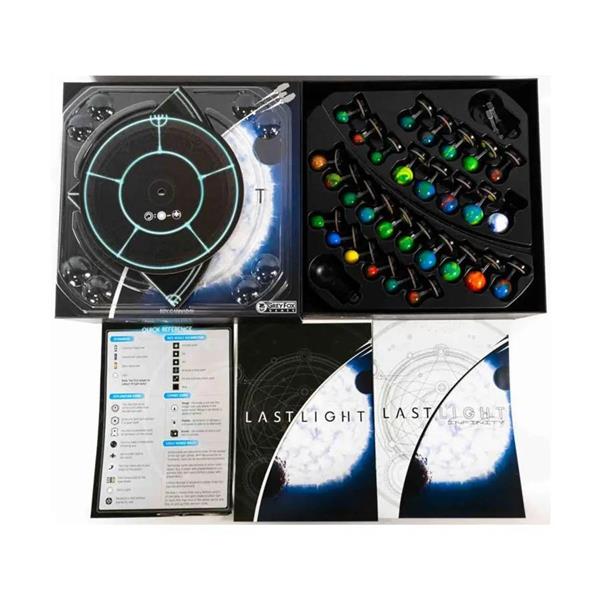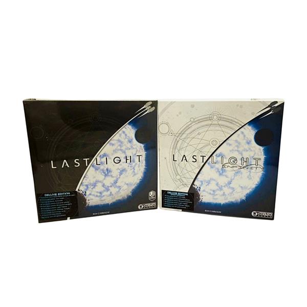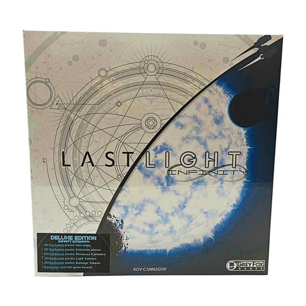 Last Light Deluxe Edition Board Game plus Infinity Expansion by Grey Fox Games: Includes core game, Infinity Expansion, 40 additional Ship miniatures (3 different sizes for 4 players), 32 additional resource extractor miniatures (8 in each player color), 60 additional Upgraded 2 color resource canisters, 12 Additional planets and stands, Additional Upgraded Light tokens, Additional Upgraded Acrylic Damage tokens, and all other unlocked stretch goals.