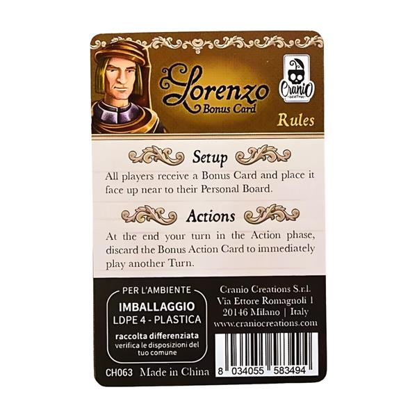 Lorenzo il Magnifico is a complex and strategic game with no luck dependence. Players will place their Family Members in different areas of the city to perform actions, but these Family Members are never the same as they change value every round. They will conquer new territories, sponsor magnificent buildings, encourage brave ventures and surround themselves with important characters. If they are smart and powerful enough, they can attract some of the most renowned contemporary celebrities and use their powers. With the expansion – Houses of Renaissance – included in the box, you can find a new player in the game and new mechanics that will greatly change the game each time you play Lorenzo il Magnifico.