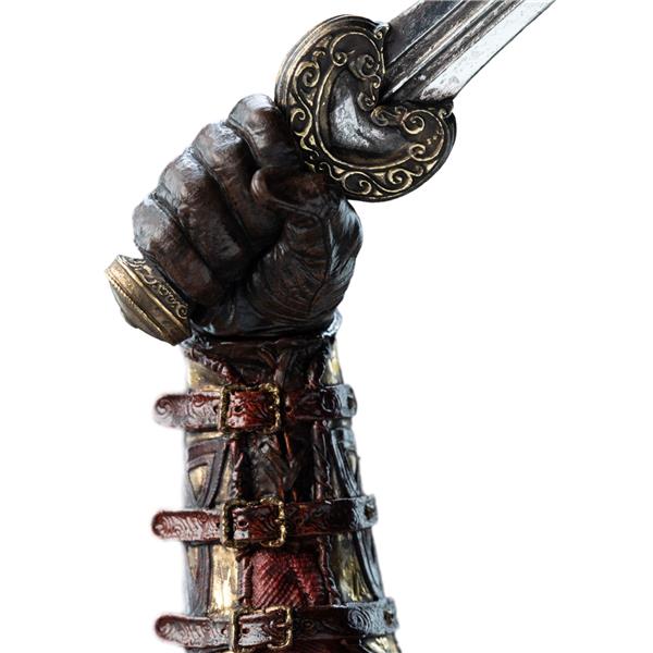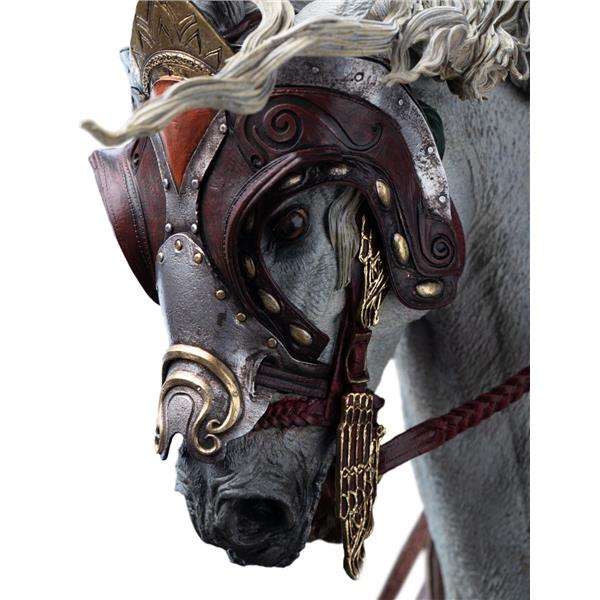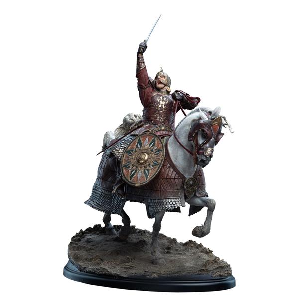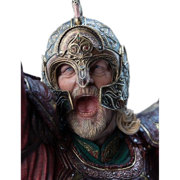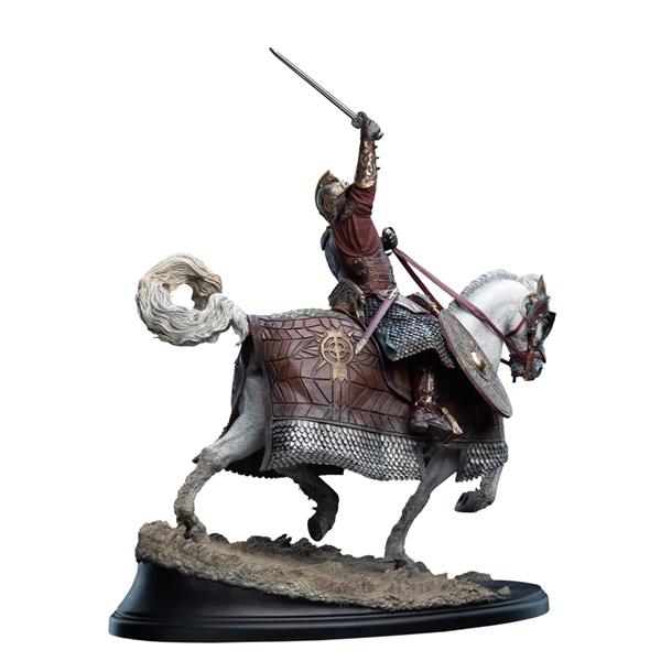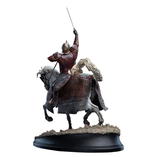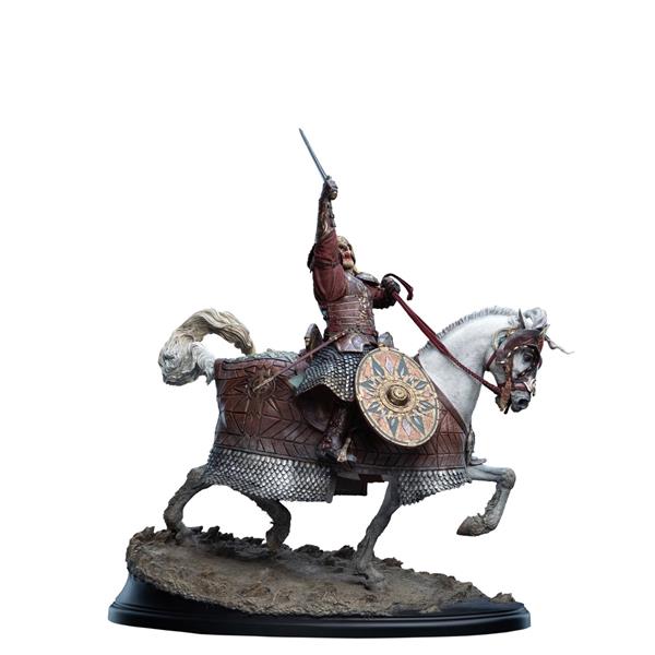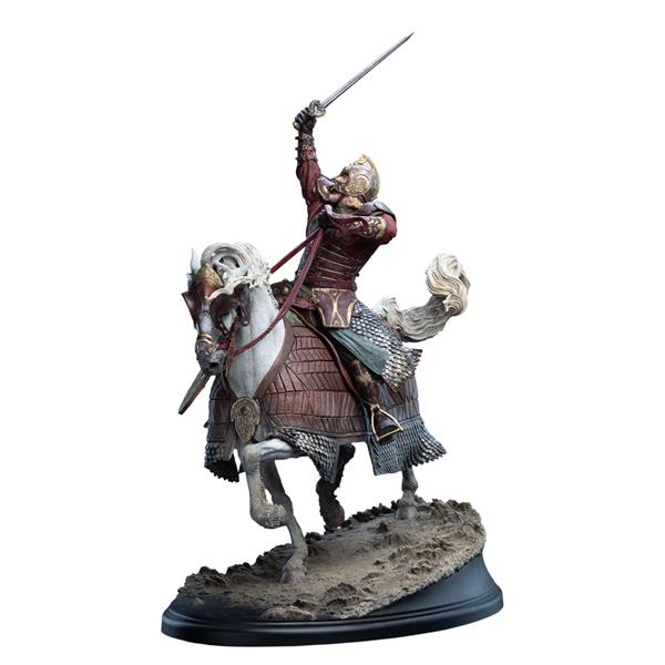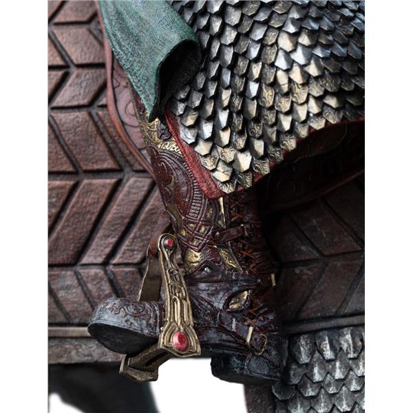 "This penultimate moment of majesty has been faithfully recreated here as a stunning sculptural masterpiece. Senior sculptor Mauro Santini worked wonders into every element of this collectible, from the imposing weight of the warhorse Snowmane™, about to burst forth with righteous fury, to the finely detailed leather armour of King Théoden, accented with brass plating and built for battle.