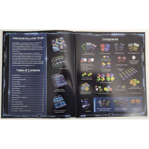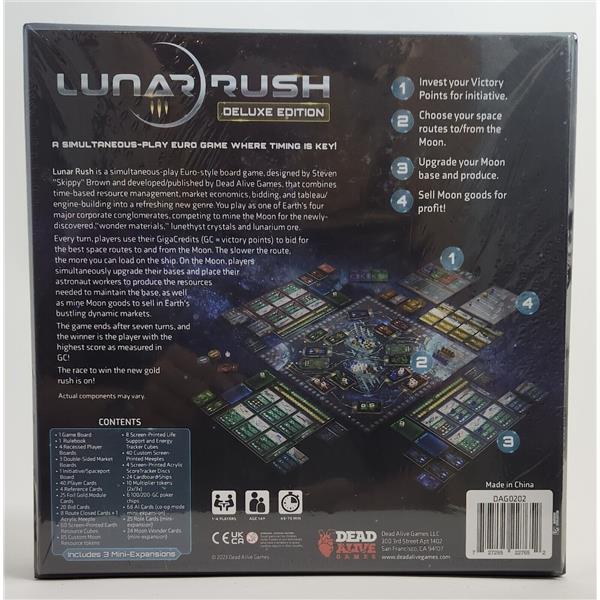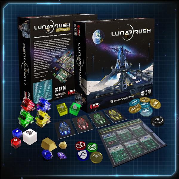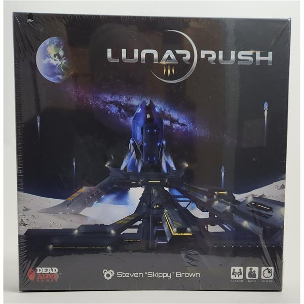 Lunar Rush is a simultaneous-play Euro-style board game that combines time-based resource management, market economics, bidding, and tableau/engine-building into a refreshing new genre. You play as one of Earth’s four major corporate conglomerates, competing to mine the Moon for the newly-discovered “wonder materials”, lunethyst crystals and lunarium ore.