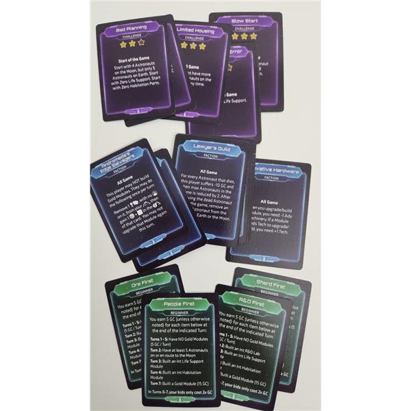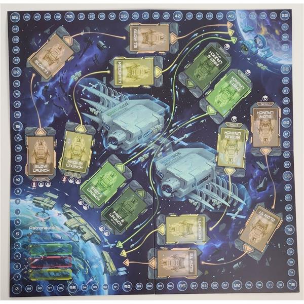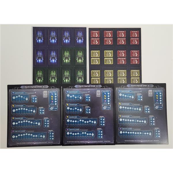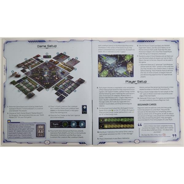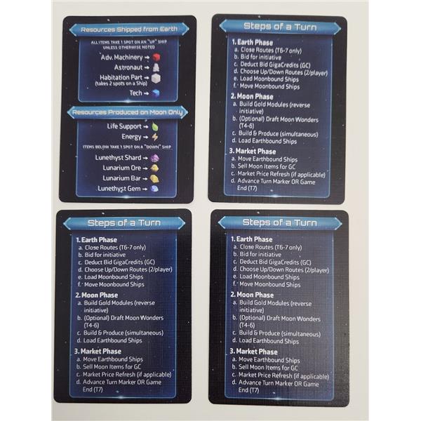 Every turn, players use their GigaCredits (GC = VP) to bid for the best space routes to and from the Moon. The slower the route, the more you can load on the ship. On the Moon, players simultaneously upgrade their bases and place their astronaut workers to produce the resources needed to maintain the base, as well as mine Moon goods to sell in Earth's bustling dynamic markets.