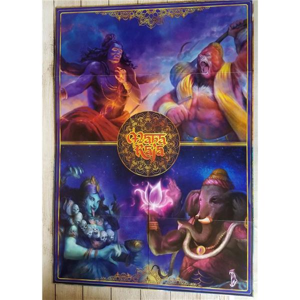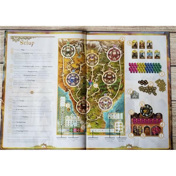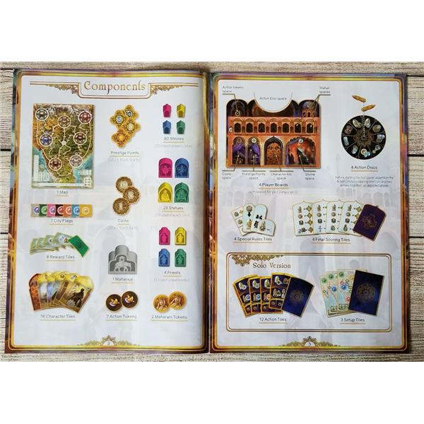 During the game, players take the role of priests who travel to different cities in India, building statues and shrines dedicated to their favorite Gods to expand their worship. To do so, they are assisted by several characters with different abilities. Every year, the Maharaja, the great king of India, will change his residence and players will receive rewards according to their Gods' worship value. At the beginning of each year, players plan their actions in a secret phase to be played simultaneously.