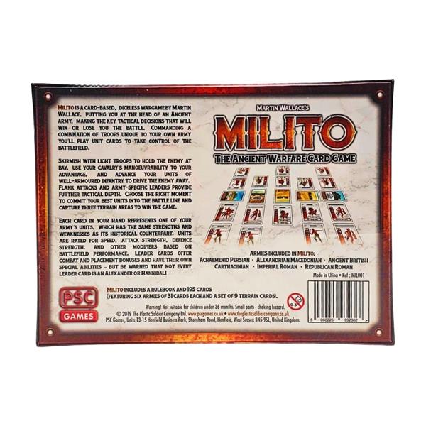 Milito is a card-based, diceless wargame by Martin Wallace that puts you at the head of an Ancient army, making the key tactical decisions that will win or lose you the battle. Commanding a combination of troops unique to your own army, you'll play unit cards to take control of the battlefield. Skirmish with light troops to hold the enemy at bay, use your cavalry's maneuverability to your advantage, and advance your units of well-armored infantry to drive the enemy away. Flank attacks and army-specific leaders provide further tactical depth. Choose the right moment to commit your best units into the battle line, and capture three terrain areas to win the game.