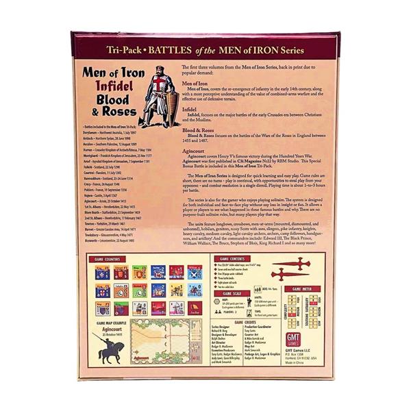 The first three games in the Series: Men of Iron (GMT): Men of Iron, Infidel: The Supremacy of Cavalry in the Crusader Era – 11th-12th Century, and Blood & Roses, plus the Battle of Agincourt from C3i #22.