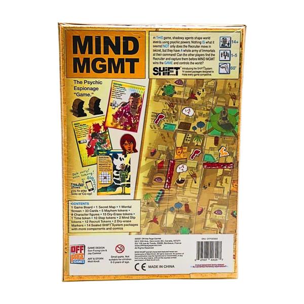 In Mind MGMT: The Psychic Espionage "Game.", one player controls Mind MGMT and must scour the city for new recruits. They move around on a secret map, trying to visit locations that match one of their three randomly drawn feature cards. They can also use their four Immortals to protect locations from being exposed.