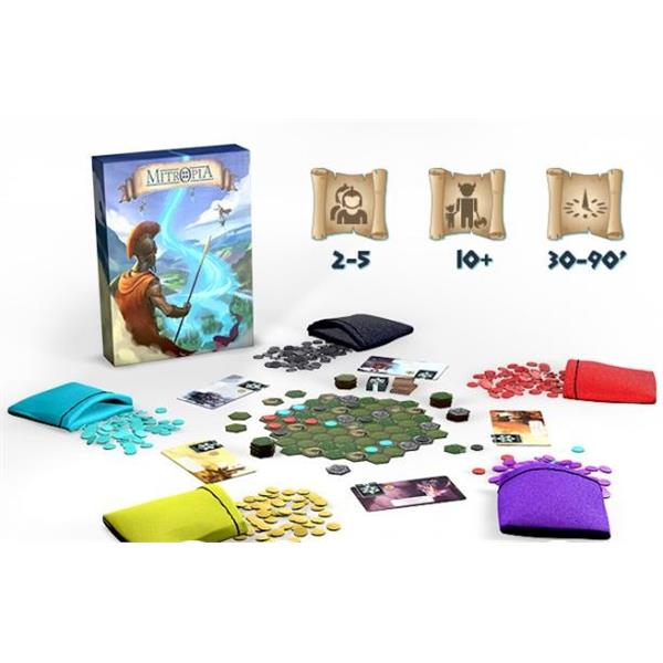 A randomized game board changes with every playthrough and introduces terrain features that increase points or change movement on the mystical battlefield. Randomness in the game is driven by two movement card decks, and a handicap mechanism gives less familiar players a leg up when getting started.