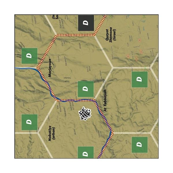 The game map features northern Israel and southern Lebanon, divided into 21 large hex territories, representing three categories of terrain: Urban (a major population center, such as the cities of Tyre, Sidon and Nabatiye), Populated (full of villages and small towns, and numerous roads), and Remote (rough terrain with few inhabitants or roads.) Stacking in any hex zone is unlimited, and units move and conduct operations within these hex zones to win the game.