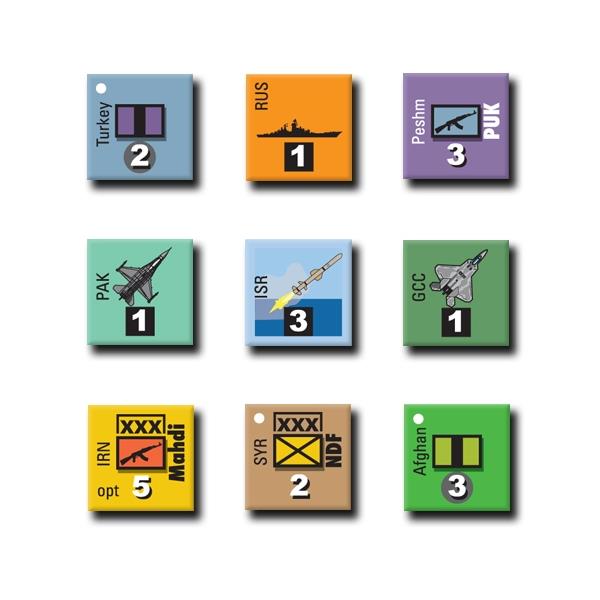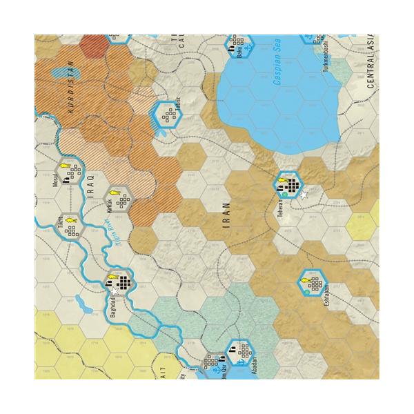 The game system models the situation at the highest strategic level. Using a variation of Ty Bomba's Putin's War (MW #29). Each hex on the map represents 62 miles (100 km) and each turn of play represents anything from three days of intense combat to a couple weeks of refitting. Ground units represent mostly corps sized formations, with some divisional task forces. Special forces units are regiments, brigades or groupings of cadres. The combat aircraft units represent various numbers of sorties needed to accomplish missions over the time frame of a turn. The game system models operations in a vast theater with limited infrastructure and coalition forces which have divergent political aims with the objective of each player being to seize critical resource, logistics and communications centers, thereby gaining control of the Middle East.