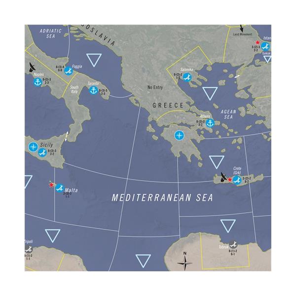 Aircraft units represent one to six squadrons, with the counter displaying the primary type of aircraft. Ship units represent one fleet aircraft carrier or battleship and “divisions” of four cruisers or nuclear-powered submarines with destroyers being represented in squadrons of six to eight destroyers or non-nuclear subs. Other ship types are represented at the division level and represent various numbers of ship types. On the map, each inch equals 20 miles. Each turn represents from one day to one week of activity, depending on the level of activity. Sixth Fleet is based on Red Dragon Rising. Changes have been made based on the situation in the Mediterranean during the Cold War.