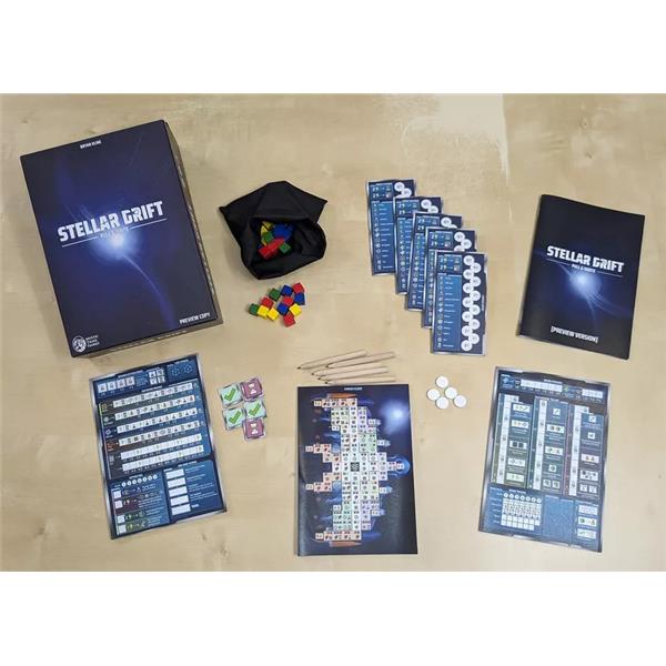 Stellar Drift is played over seven rounds. At the beginning of each round, the players draw random colored cubes out of a shared central bag. These cubes represent the resources the players have that round. Each player may then spend those cubes to move around their ship, conducting repairs as they go. Each player has their own separate game sheet with a spaceship-shaped grid on it, and squares in this grid are marked off as the players move through them. Play is simultaneous, players are all pulling cubes from the bag and marking off their sheets at the same time. Each ship grid square costs some cubes of specific color(s), and gives the player rewards in the form of movement on their 'ship status' tracks, which gives various benefits such as more resources, special abilities, and victory points.