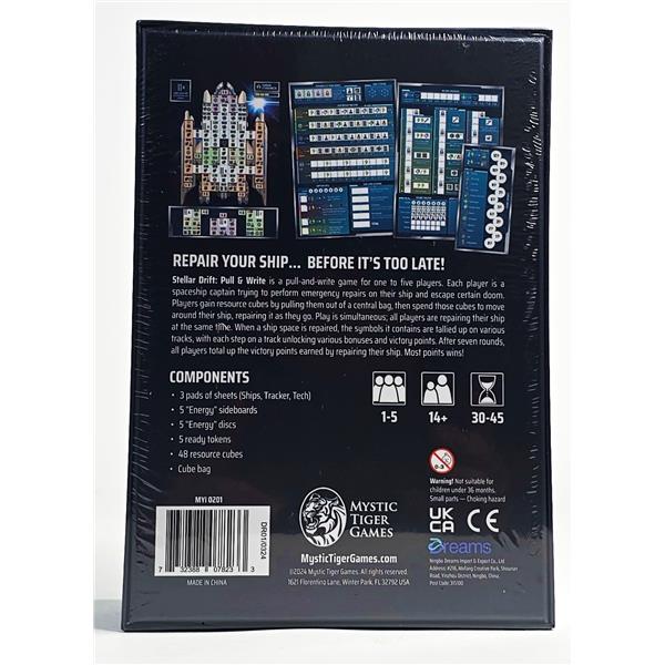 At the end of the seven rounds, players tally up the victory points they scored for successfully restoring the various ship systems. Most points wins! A game of Stellar Drift typically takes between 30 to 45 minutes, regardless of the number of players. Stellar Drift is intended for players ages 14 and up.