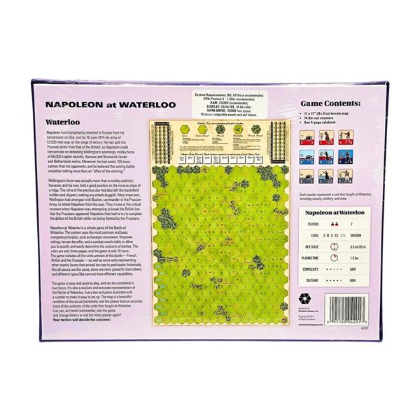 Napoleon at Waterloo is a simple game of the Battle of Waterloo. The system uses the most common and basic wargame principles, such as hexagon movement, firepower ratings, terrain benefits, and a combat results table to allow you to quickly and easily determine the outcome of battles. The rules are only three pages, and the game is only 10 turns.