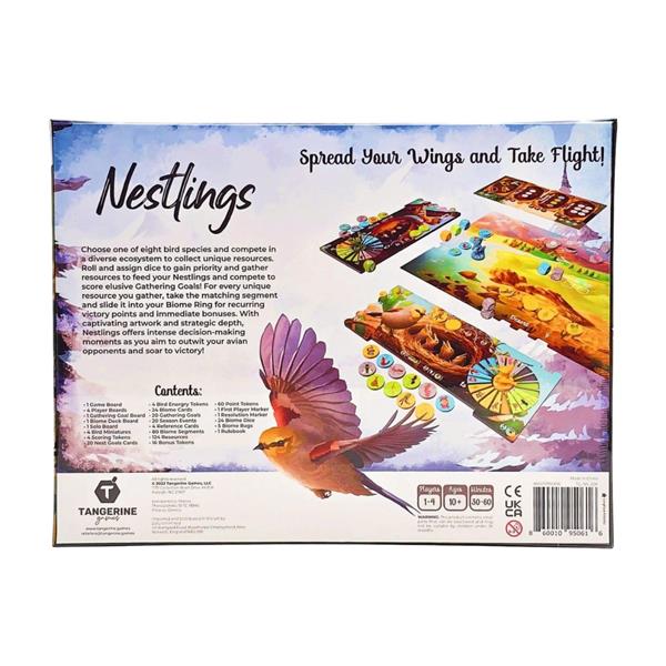 As the game progresses, the tension rises as players must make key decisions along the way, decisions that could secure victory or usher in defeat. Will they feed their nestlings for more immediate points, or take a different resource to complete a section of their resource ring, thus earning a bonus and triggering a powerful chain reaction? Will they use in-game currency to activate another end-of-game nest goal or save it for victory points? Will they place a second die to secure priority or risk it and head to another biome to take other much-needed scraps?