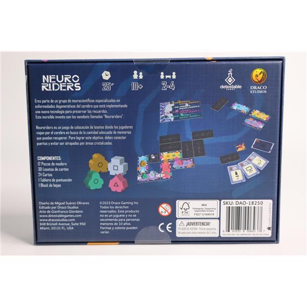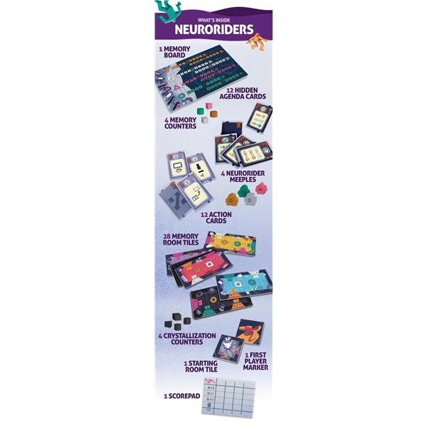Neuroriders is a tile-laying game where the players will be traveling around the brain looking for the right amount of data they can take care of. To achieve this goal, they have to connect doors and avoid getting caught by crystalized areas.