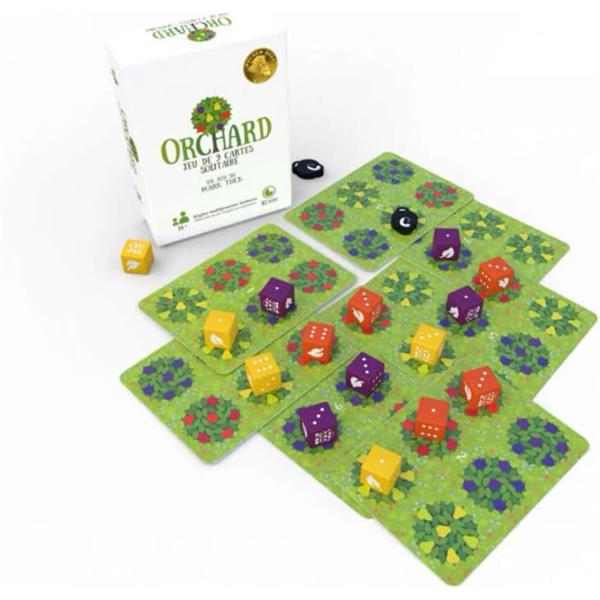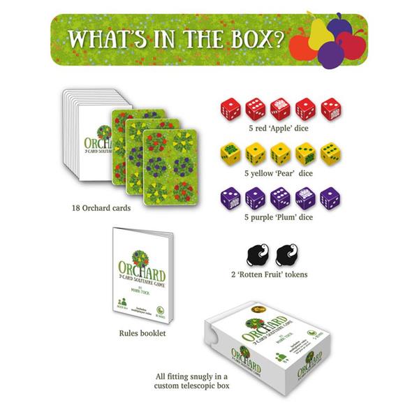 Orchard is a quick solitaire ’tile laying’ game that plays in under 10 minutes. The aim of the game is to harvest fruit (score points) by playing cards so that their fruit trees overlap other trees already in the orchard that bear the same fruit. The more trees you can overlap, the more fruit you’ll pick.