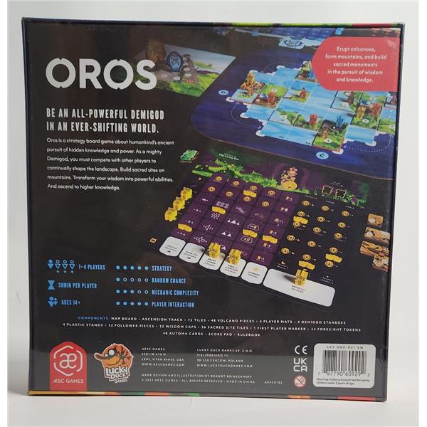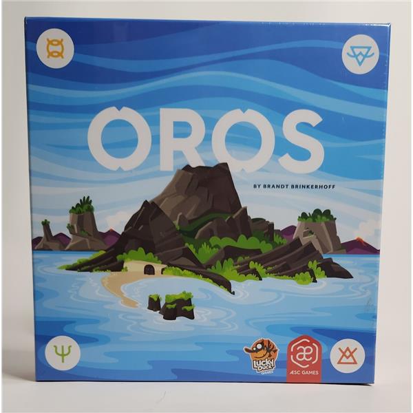 Oros is a tile-colliding, volcano erupting, mountain-making, wisdom-gathering, action-economy strategy game. On individual player mats, players move their Followers between action spaces, allowing them to manipulate a shared environment like a giant puzzle of plate tectonics. Action spaces allow players to shift rows of land, move and collide land tiles, form and erupt volcanoes, worship to gain wisdom, journey their Followers around the ever-shifting landscape, and build sacred places of study and worship on mountains. Building sacred places and worshipping in sacred places brings wisdom which is used to improve the abilities available for each action space. Wisdom is also used to improve the end game value of each sacred place built as well as reach other goals worth end game points.