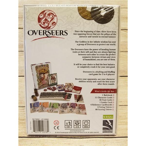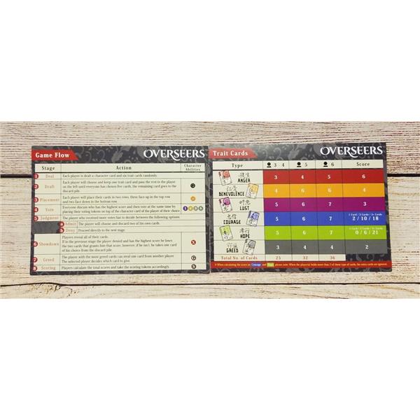 The game might have other phases depending on the type of overseers being played as each character has special abilities that can change the outcome of the game, such as being able to peek at another player's hidden cards, steal a card before the scoring phase, or transform one card into another.