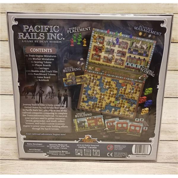 In Pacific Rails Inc, players are the Presidents of rival railway companies. Using worker placement and resource management, players compete to build a continuous track from one side of the board to the other. When the two sides meet, the end of the game is triggered and glory await those who have built the best railway.