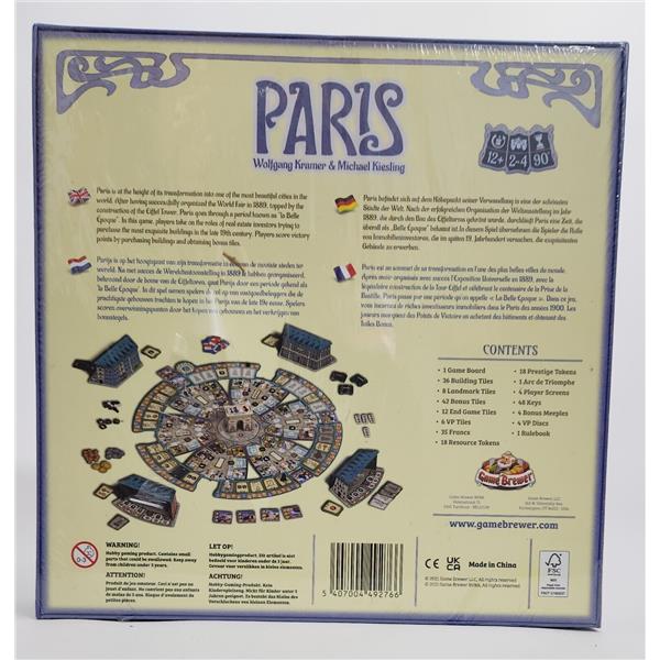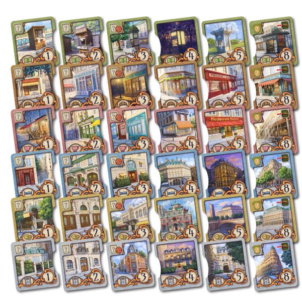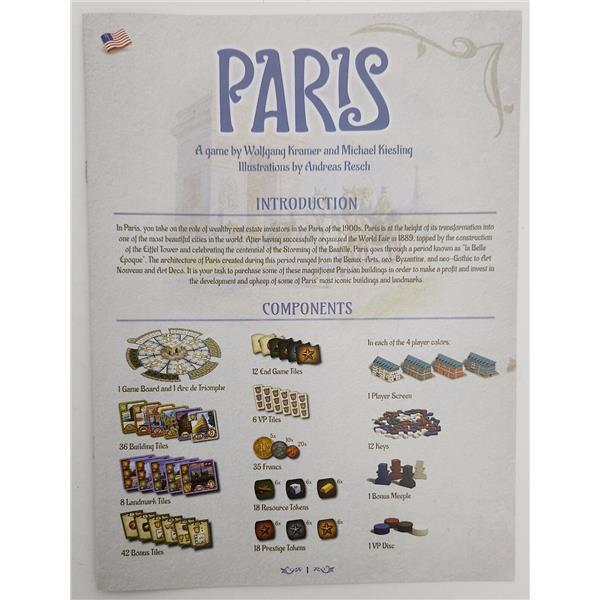 Paris is a typical medium-weight Kramer and Kiesling Eurostyle-game with straightforward gameplay, short player turns, and an ingenious point salad mechanism. You mainly score points by obtaining the right buildings and collecting the right bonus cards.