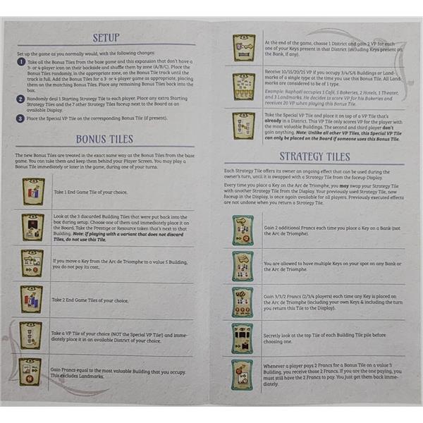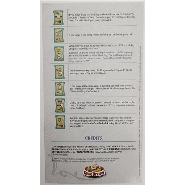 Paris is a typical medium-weight Kramer and Kiesling Eurostyle-game with straightforward gameplay, short player turns, and an ingenious point salad mechanism. You mainly score points by obtaining the right buildings and collecting the right bonus cards.