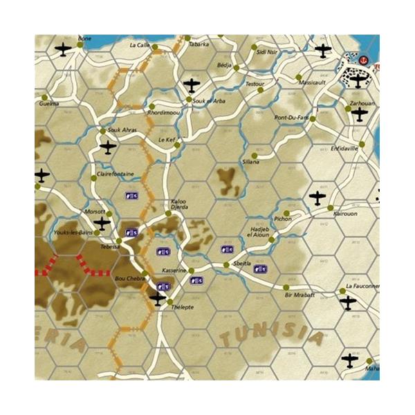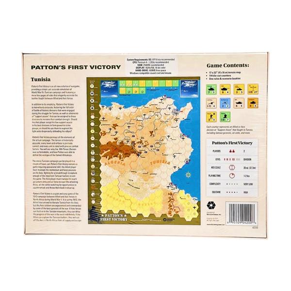 Patton’s First Victory recreates the 1943 Tunisian Campaign, and can be played in 1-2 hours. Featuring a full order of battle of all the historic divisions, Patton’s First Victory also includes “support assets” that can be assigned to divisions to increase their strength. Should the Axis player assign his support assets to his best divisions, or use them to augment his light units? The Allied player must maintain the momentum, fighting for a breakthrough to capture enough of the important Tunisian harbors to win. The Axis player must manage his scant yet potent army to repel the attacking Allies, while watching for opportunities to counterattack and throw them back. The Allies possess material superiority, but the Axis units are experienced and are defending in mountainous and constricted terrain. Additionally, Patton’s First Victory (PC), the full computer version, administers all rules and game functions, allowing players to focus on strategy, and includes internet play functionality, interactivity options (mouse and quick-key, turn restarts, auto save, etc.), and even an option to modify the victory conditions. The program even provides a statistical analysis of combat results, a strategy guide, automated supply, plus options to turn on/off ZOC, hex control, unit info, casualties, and more. Sound effects (which can also be turned on or off) will immerse you in the game for the full cinematic experience.