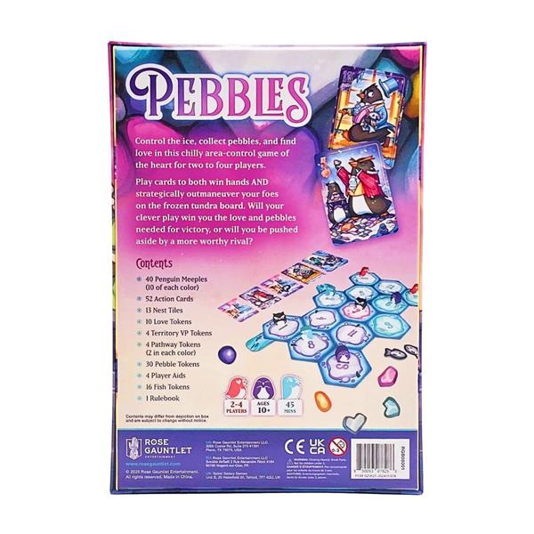 Control the ice, collect pebbles, and find love in this chilly area-control game of the heart for two to four players. Play cards to both win hands AND strategically outmaneuver your foes on the frozen tundra board. Will your clever play win you the love and pebbles needed for victory, or will you be pushed aside by a more worthy rival?