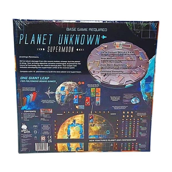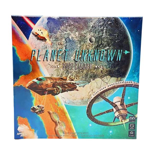 The meteor strikes have caused great damage. We’ve gathered as much wreckage as possible so please use the salvage carefully. Complete the primary objective and build the planet that will preserve humanity. Expand your developments onto the Supermoon in case the meteorite hazards get out of hand. Planet Unknown is a polyomino tile-laying game that mixes tile-placement, engine-building, simultaneous play, and resource and rover management for a unique and competitive gameplay experience. Supermoon is the first expansion.