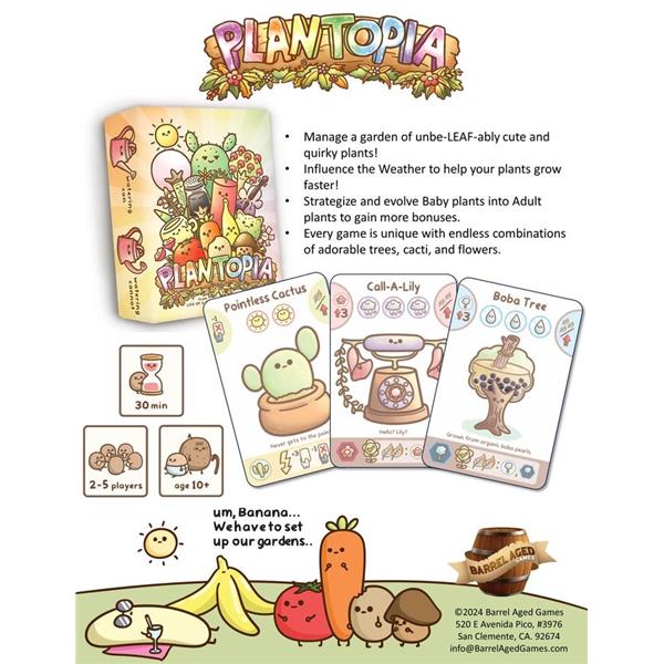 Plantopia is a strategy card-based game where players harness their gardening abilities to contend for the coveted title of Plantopia’s Champion Gardener. Manage the plants in your hand and in your tableau and plant the best combos to earn the most magical leaves. But pay attention to all of your fellow gardeners, as whoever can predict the weather can make their plants grow!