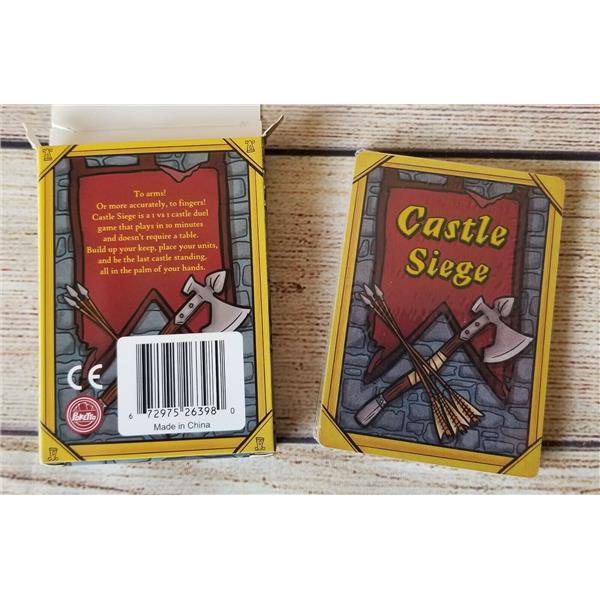 Castle Siege is a 1-2 player handheld play tower defense card game. In it, each player arranges their entire castle between the fingers of one hand, beginning with just the castle keep. From there, the players play cards to add towers, or to attack their opponents castle with archers, battering rams, explosives, and trolls. Play proceeds with towers and attackers taking damage until one player's keep is destroyed.