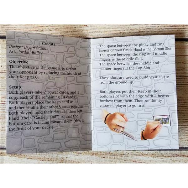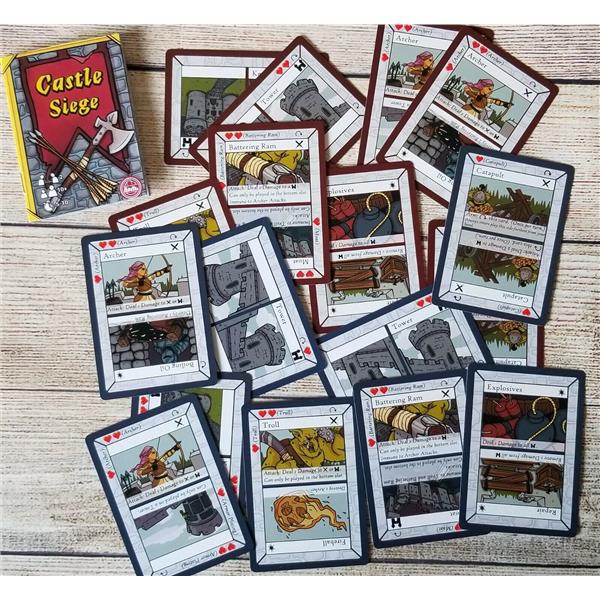 In solo mode, players lay out their keep and two towers on the table to build a castle. Archer cards make up the active defenses, and attacking cards are drawn from the enemy deck. Their attacks are launched on your towers, your archers and then your keep unless you can successfully fend them all off with your archers.