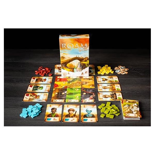 In Roam, you and up to three friends compete to find lost adventurers. The game includes more than fifty unique, tarot-sized adventurer cards, which feature characters from Near and Far, Above and Below, and Islebound. The opposite side of each card depicts a landscape split into six squares, and two rows of three of these cards are placed in the center of the playing area to make the board.
