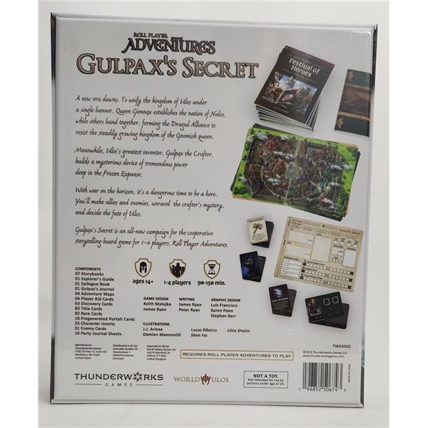 Roll Player Adventures: Gulpax’s Secret is an all-new campaign for the critically-acclaimed co-operative storybook board game for 1-4 players. Players take on the role of fantasy heroes in seven new adventures, facing new challenges, exploring new environments, meeting new characters in the World of Ulos, and making meaningful decisions that change the story along the way.