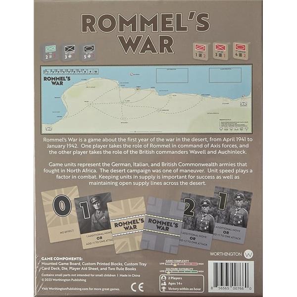 Rommel's War is a 2 player game about the first year of the war in the desert, from March to December of 1941. One player takes the role of Rommel in command of Axis forces, and the other player takes the role of the British commanders (Wavell and Auchinleck).